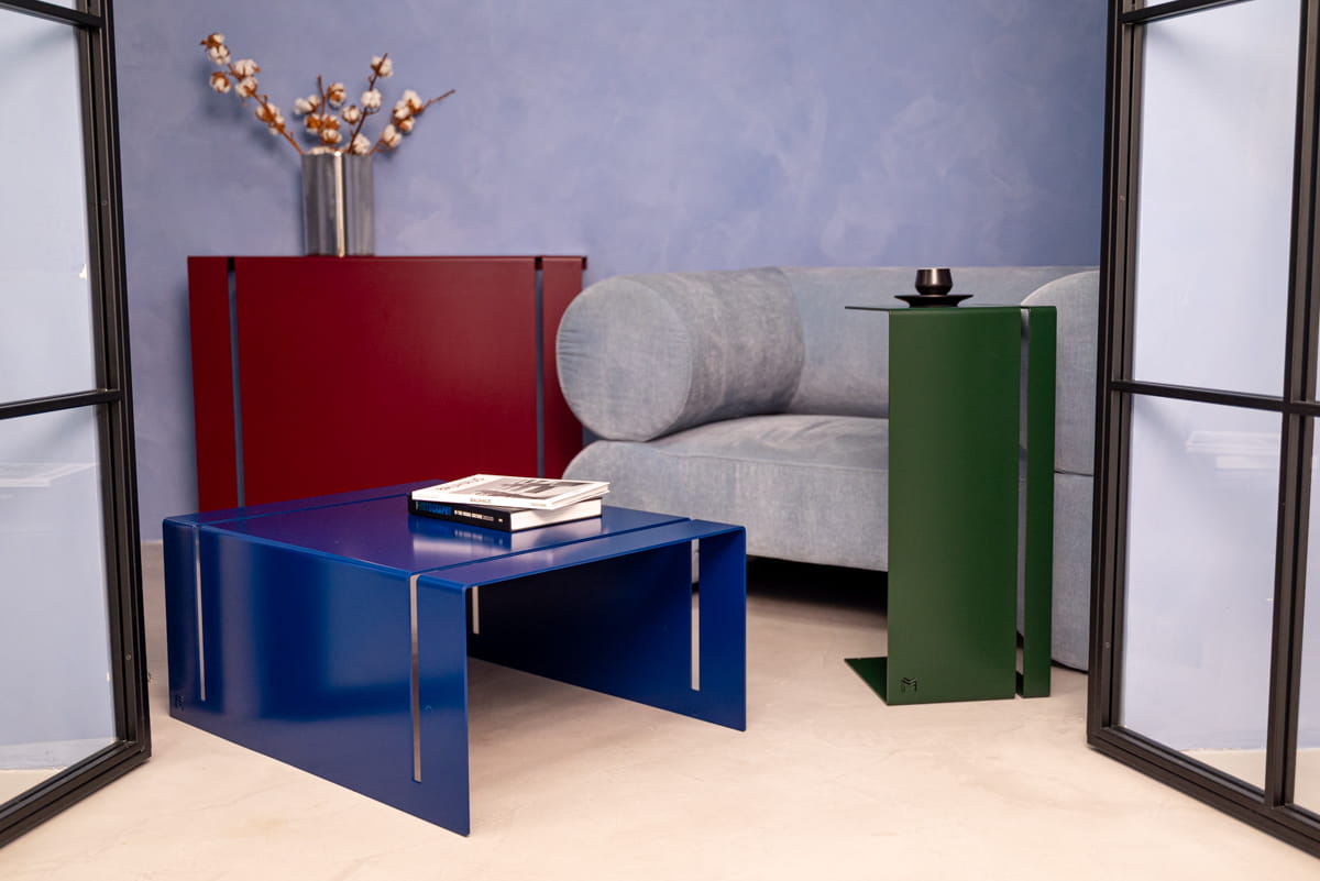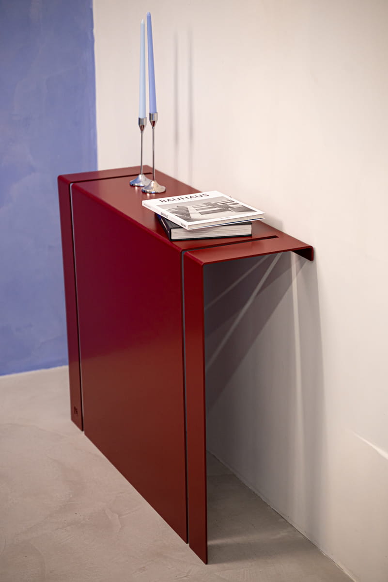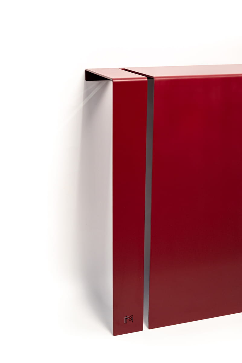Konsola wykonywana jest w całości ze stali malowanej proszkowo. Zastosowana technologia formowania pozwala uzyskać czystą, jednolitą bryłę bez widocznych spawów i łączeń, co podkreśla minimalistyczny charakter mebla i jakość wykonania.