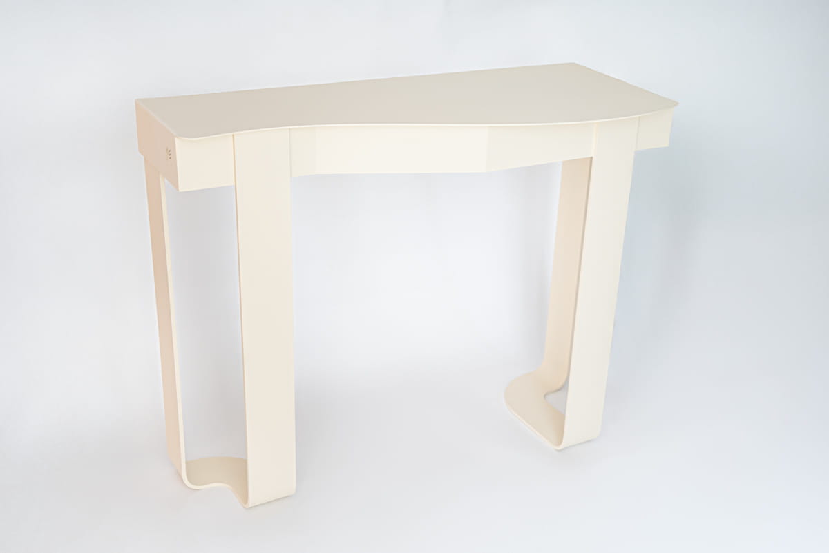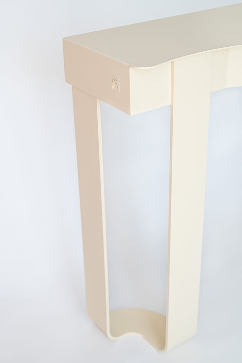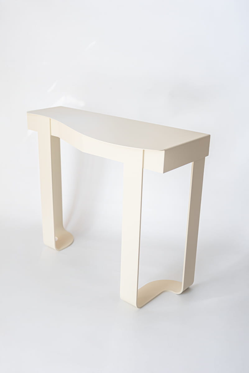FLUX to stalowa konsola zaprojektowana jako spokojna, płynna forma użytkowa. Zaokrąglona linia blatu łagodzi geometrię konstrukcji i wprowadza miękki rytm, który kontrastuje z masą oraz sztywnością materiału.
