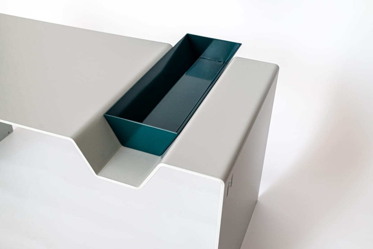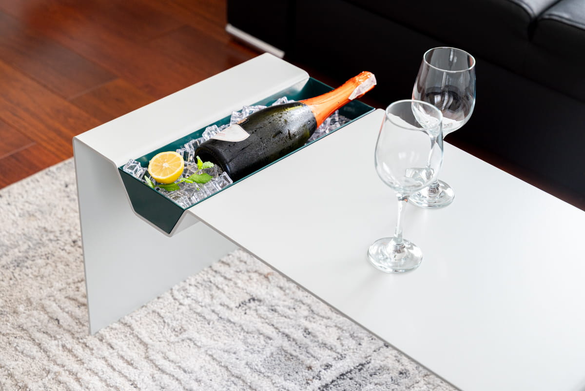 Zamknięta, minimalistyczna bryła pozostaje spokojna i neutralna w przestrzeni. Po wysunięciu patera wprowadza dodatkowy poziom użytkowy – do serwowania, odkładania lub organizowania przedmiotów codziennego użytku.