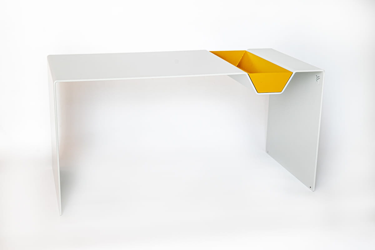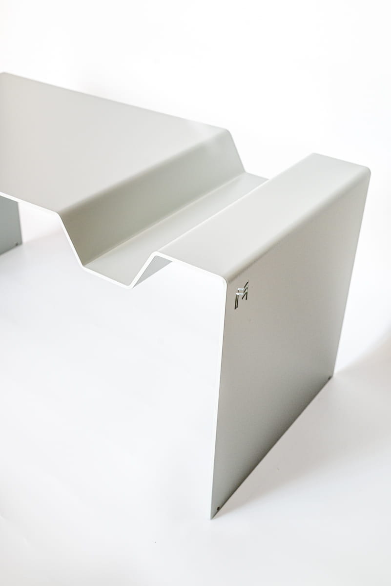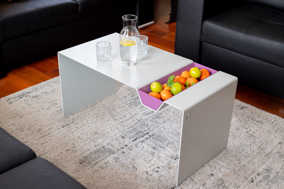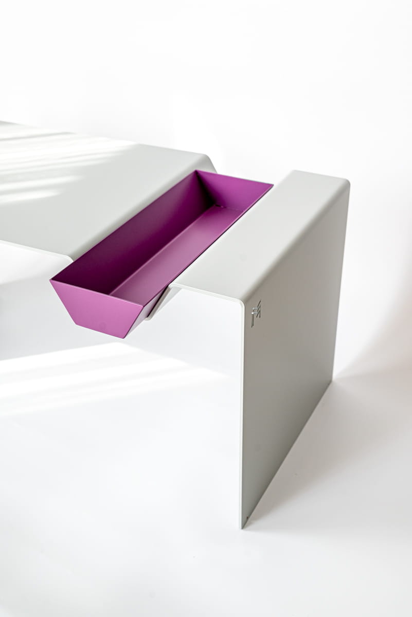 APERTO to stalowy stolik zaprojektowany jako obiekt użytkowy z jednym wyraźnym gestem – wysuwaną paterą, która zmienia sposób korzystania z mebla. Element ten stanowi integralną część konstrukcji i definiuje funkcję całej formy, a nie jedynie dodatek do blatu.