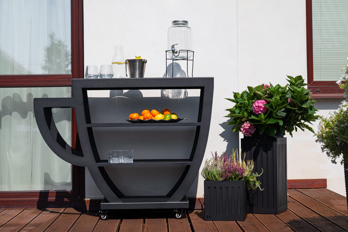 Zastosowanie aluminium zapewnia odporność na warunki atmosferyczne, dzięki czemu Cup&Roll może być użytkowany zarówno we wnętrzach, jak i na tarasach czy w ogrodach. Jednocześnie konstrukcja pozostaje lekka, co ułatwia codzienne przesuwanie i zmianę ustawienia.
